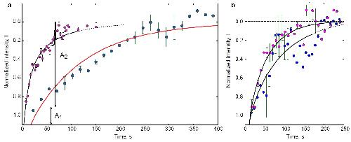 Figure 5: FRAP data fitted with a two-exponential equation. Averaged normalised data with error bars and approximation curves are plotted for each experiment. The determination coefficient (R2) is presented for each group of observations, as well as the weight of the fast exponent, αâ=âA1/A2 (as shown in Fig. 4); this value reflects the ratio of free-to-adsorbed protein (analysis details are described in Supplementary Materials and Methods, 1.3). |
