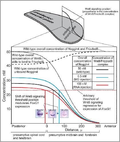 Figure 7: Mathematical modelling of the Noggin4 influence on the anterior-posterior Wnt8 signalling gradient. During neurulation, Wnt8 diffusing from the posterior regions within the anterior neural plate and interacting there with Frizzled8 forms a gradient of Wnt8 signalling, which is schematically presented by a solid black line within the rectangle standing along the neural plate midline on the schema shown above. Coloured curves within an enlarged version of this rectangle (below) demonstrate the theoretically calculated spatial distribution of the Wnt8/Frizzled8 complex (i.e., Frizzled8 receptor activated by Wnt8 binding) at three concentrations of Noggin4 (wild-type, decreased by Noggin4 MO injections and incresased by Noggin4 mRNA injections) indicated in the inserted table. Three inserted photos illustrate the assumed effects of the corresponding spatial shifts of the Wnt8/Frizzled8 complex arbitrary threshold concentration on the forebrain marker FoxG1 expression. See main text, Supplementary Materials and Methods 4.2 and Fig. 1 for details. |