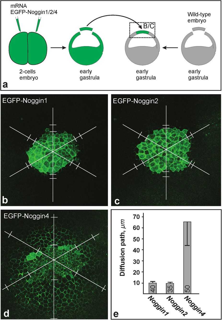 Figure 3: Diffusion of EGFP-Noggin1/2/4 from the ectodermal grafts. (a) Experimental design. The region that corresponds to images (bâd) is framed by a dashed rectangle. (bâd) Representative examples of the grafts 1 hour after transplantation. Note that in contrast to recipient embryo cells, graft cells contain EGFP-Noggin1/2/4 in the cytoplasm. To compare the diffusibility of the EGFP-Noggin1/24, the diffusion path (DP) was measured for each graft in six directions (white lines radiated under 60 degrees from the approximate centre of the graft), beginning from the graft border until the point at which the EGFP fluorescence level in an IS became equal to the background fluorescence level in the donor IS (pairs of white bars perpendicular to the radial lies). (e) Medium DP and deviation calculated for all grafts per type (number of grafts is indicated within each column). |