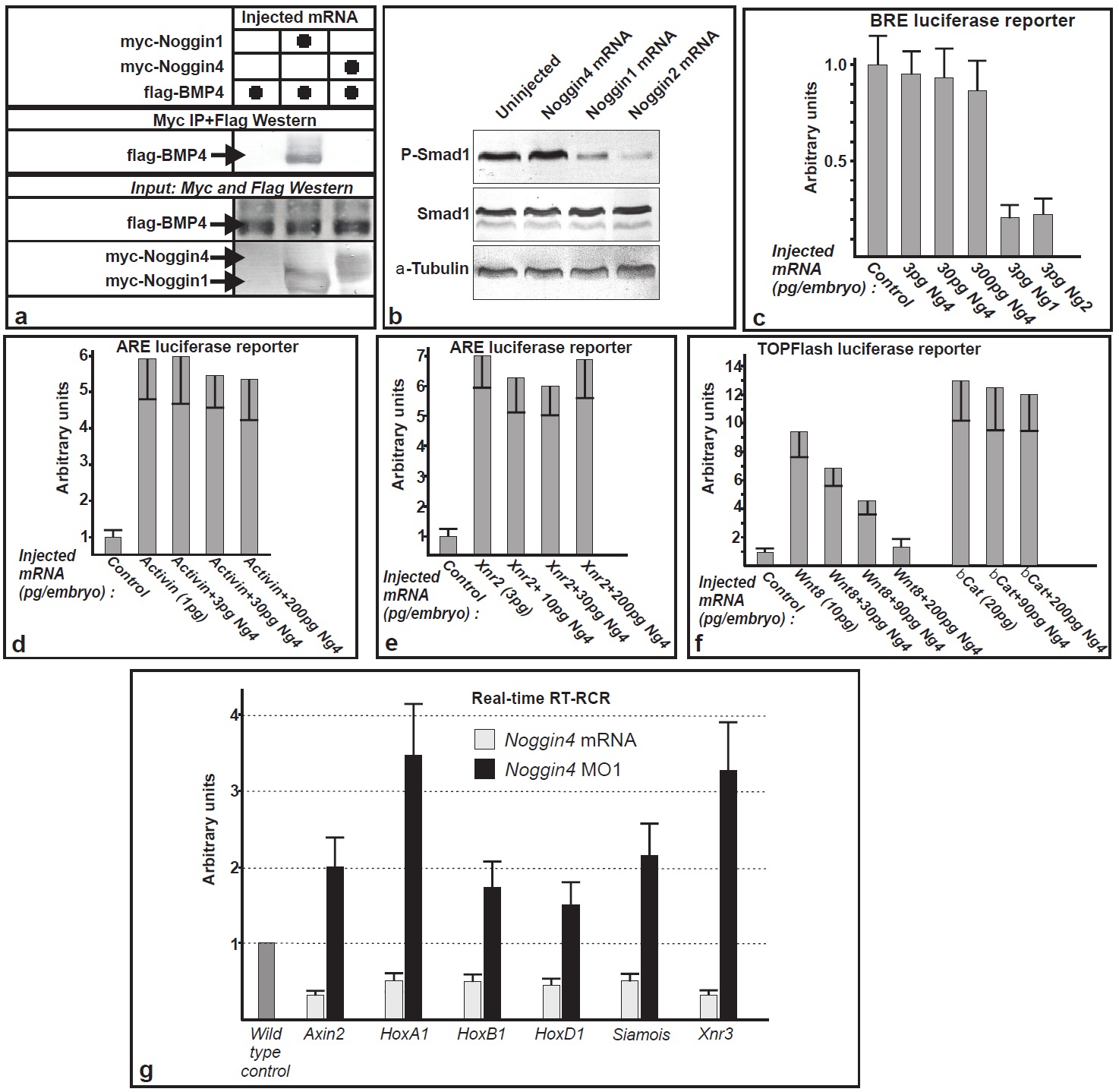 Figure S2. Noggin4 cannot antagonise BMP and Activin/Nodal signalling but inhibits Wnt/b-Catenin pathway. (a) Comparison of Noggin1 and Noggin4 abilities to bind BMP4, using immunoprecipitation. (b) In contrast to Noggin1 and 2, Noggin4 does not cause reduction of endogenous phosphorylation of Smad1. Embryos were injected with Noggin1/2 or Noggin4 mRNA (100pg/embryo) and phosphoSmad1 was detected on Western-blot by anti-phosphoSmad1 antibody (Cell Signaling Technology, Inc.). Overall level of Smad1 was detected by anti-Smad antibodies (ab66737, Abcam). Alpha-tubulin serving as a loading control was revealed by anti-tubulin antibodies (DM1A, Sigma). In all these cases, Fab fagments of Anti-Rabbit antibodies conjugated to alkaline-phospotase (A3937, Sigma) were used for detection of primary antibodies. (c) Effects of Noggin1, Noggin2 and Noggin4 on expression of the BMP-specific luciferase reporter, BRE. Embryos at two-cell stage were injected with BRE plasmid, either alone (control) or mixed with Noggin1 or Noggin2 mRNAs taken in a fixed concentration, or Noggin4 mRNA taken in increasing concentrations. (d and e) Effects of Noggin4 on expression of the Smad2-specific reporter ARE activated by ActivinB or Xnr2. (f) The effect of Noggin4 on expression of the Wnt/b-Catenin-specific reporter TOPFlash activated by Wnt8 and b-Catenin . (g) qRT-PCR analysis of expression of the direct genetic targets of the canonical Wnt pathway: Axin2, HoxA1, HoxB1, HoxD1, Siamois and Xnr3, in the late gastrula embryos (stage 12) injected at 4-cell stage with Noggin4 mRNA or Noggin4 MO1. For each of the tested genes, the expression level in the wild-type embryos was taken as one unit. |