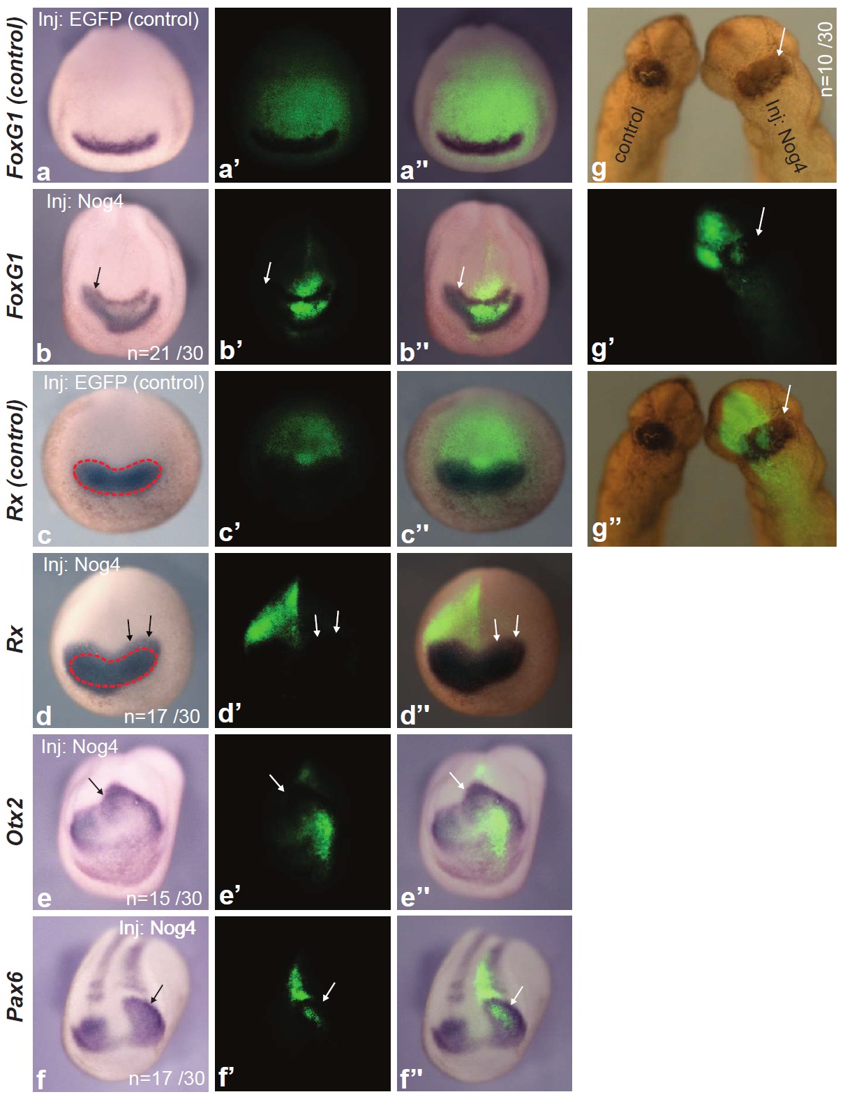 Figure S5. Noggin4 acts cell-non-autonomously when promoting the expression of anterior markers. (a) Control embryo injected in dorsal blastomeres with EGFP mRNA mixed with FLD tracer at 8-cell stage and hybridised at the midneurula stage with FoxG1 probe. This embryo is presented for comparison of width of the control FoxG1 expression band with width of FoxG1 expression band in the embryo injected with Noggin4 mRNA and shown on b. (b-f) Midneurula embryos injected with Noggin4 mRNA mixed with FLD tracer unilaterally, in one of the animal dorsal blastomeres, at 8-cell stage and hybridised with probes to the indicated marker genes. Arrows indicate areas in which overexpression of the tested marker genes does not match the localisation of FLD, thereby confirming cell-non-autonomous activity of Noggin4. (aâ-fâ) Fluorescent images of the same embryos as on aâf. (aââfâ) Superimposed images of aâf and aââfâ. (gâgâ). An expanded cement gland on the non-injected side of the tail-bud stage embryo (right embryo), which was injected in the right animal dorsal and ventral blastomeres at 8-cell stage, confirms cell-non-autonomous activity of Noggin4. |