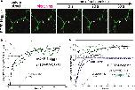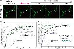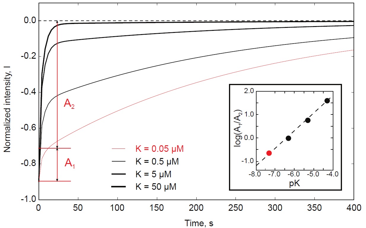 Figure S13. FRAP kinetics with different dissociation constants formed by numerical solution of the system of equations (S1.5). Parameter values were set as following: ko f f = 1=250sô1; l = 7:5mm; b(0) = a(0) = 1mM; D = 1mm2=s; initially bleached protein was distributed normally with dispersion equal to a half of the reactor length l. The step of the coordinate grid was l/100; integration step was 2 10ô4 s. Every numerical curve was fitted to the two-exponential equation and the ratio of pre-exponential factors A1;2 (S1.11) is shown against the dissociation constant in double-logarithmic coordinates (insert). |
