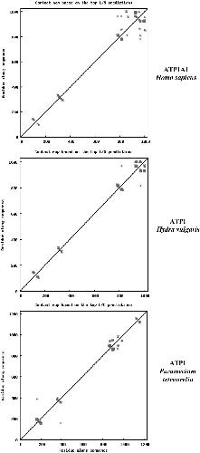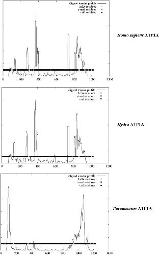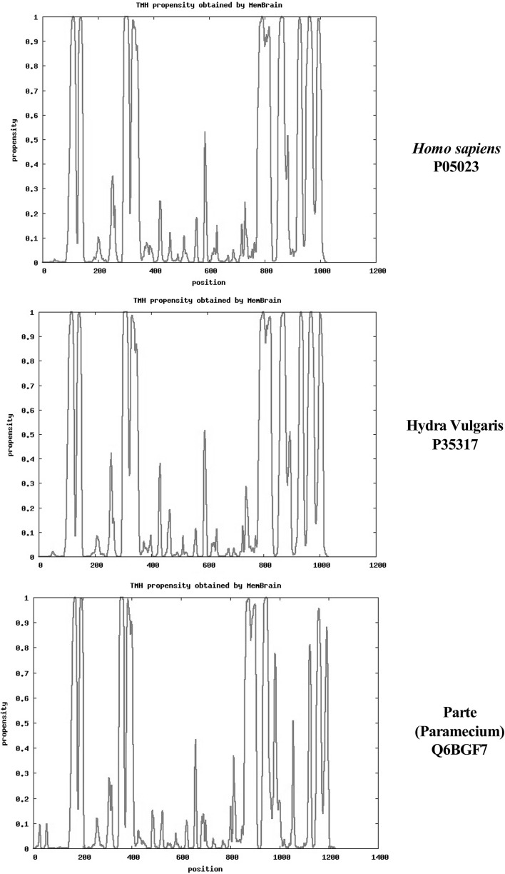 sapiens (top, #P05023), Hydra vulgaris (middle, #P35317), and Paramecium tetraurelia (bottom, Q6BGF7) using the MemBrain algorithm. The abscissa represents the sequence positions; the ordinate indicates the propensity of TM helices. Plots were obtained as described in “Methods” section