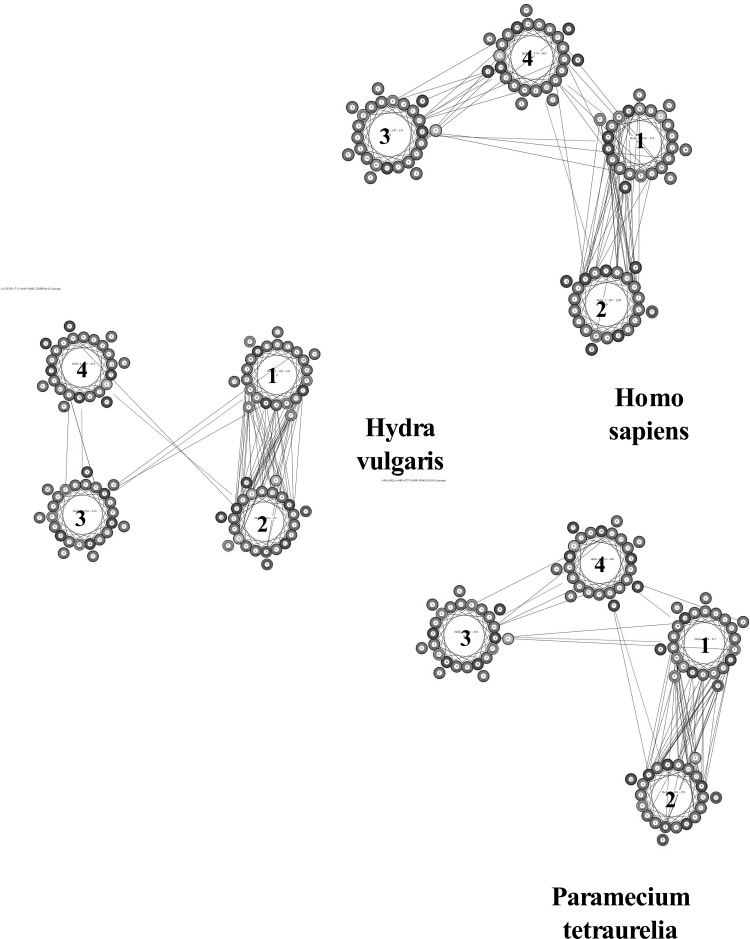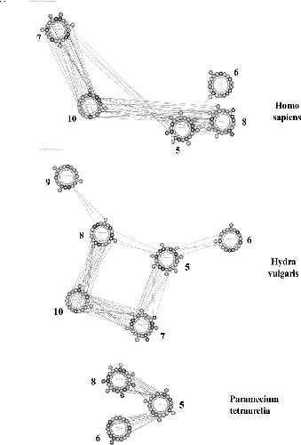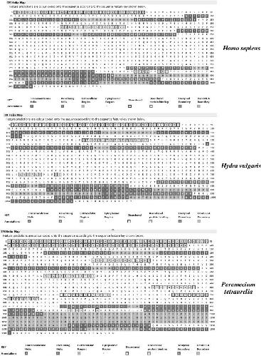 sapiens (upper plot), Hydra vulgaris (middle plot), and Paramecium