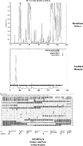 Fig. 4. A comparison of four MEMPACK-SVM defined TM helices (TM-1–TM-4) in the N-terminal regions of α-subunits of Homo sapiens (top graphic, P05023), Hydra vulgaris (middle graphic, P35317), and Paramecium tetraurelia (bottom graphic, Q6BGF7). Colors in the MEMPACK cartoon indicate hydrophobic residues (blue), polar residues (red), and charged residues (green for negative, purple for positive). Lines between residues indicate predicted helix–helix interactions