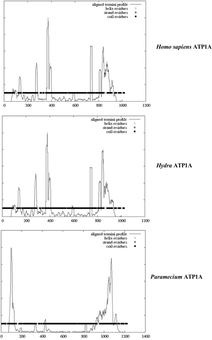 Fig. 6. Comparisons of the topology of TM helices, disordered regions, and pore-lining regions of Na/K-ATPase α-subunit of Homo