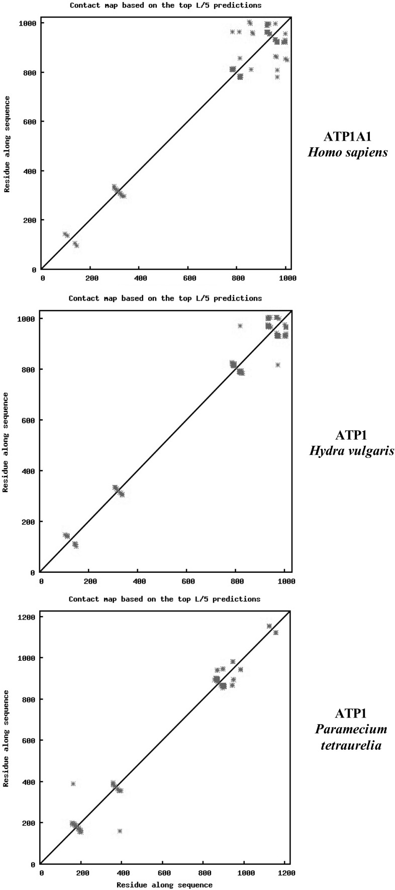 Fig. 3. Comparisons of the contact maps based on the top L/5 predictions for ATP1A1 of Homo sapiens (top), Hydra vulgaris (middle), and Paramecium tetraurelia (bottom). Plots were obtained as described in “Methods” section