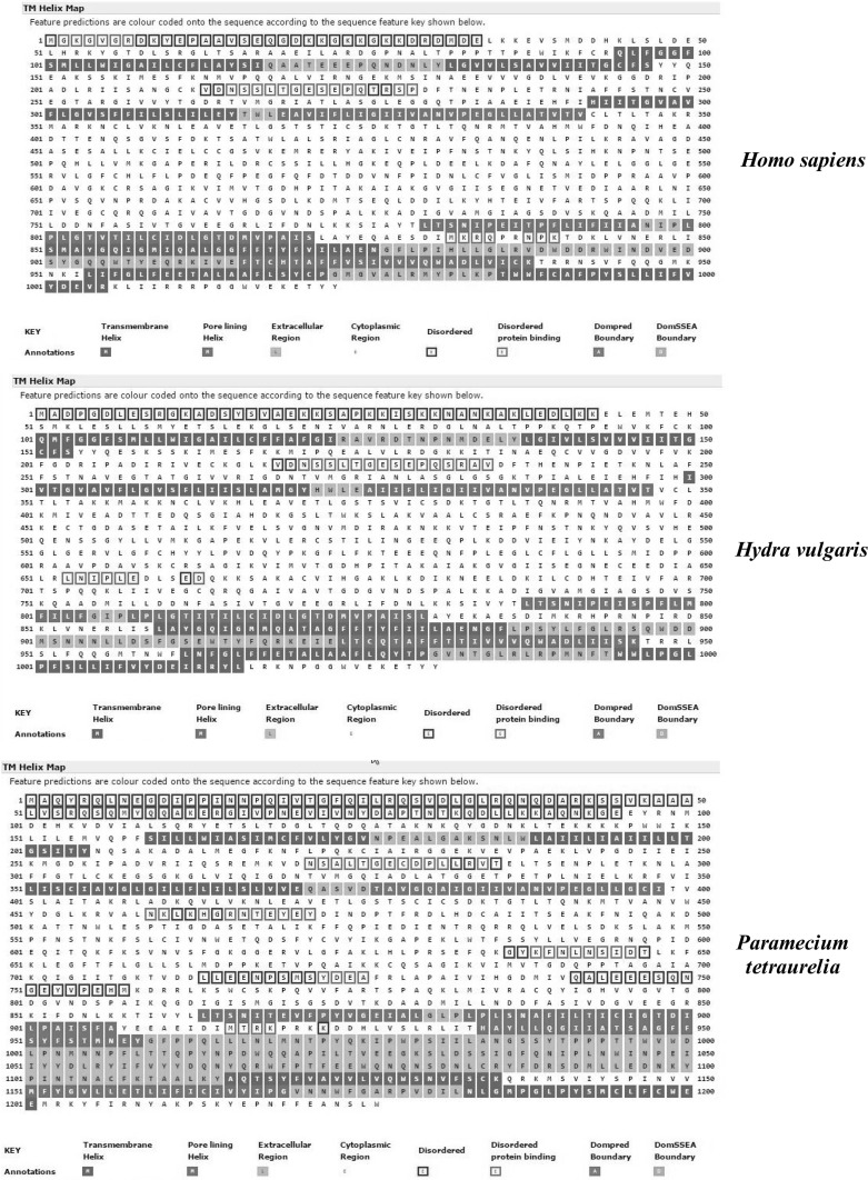 Fig. 5. A comparison of six MEMPACK-SVM defined TM helices (TM-5–TM-10) in the C-terminal region of α-subunits of Homo sapiens (top graphic, P05023), Hydra vulgaris (middle graphic, P35317), Paramecium tetraurelia (bottom graphic, Q6BGF7). Predicted TM helices are indicated in black. Blue squares indicate predicted pore-lining regions. Extracellular regions (membrane loops) are in orange. See “Methods” section for details