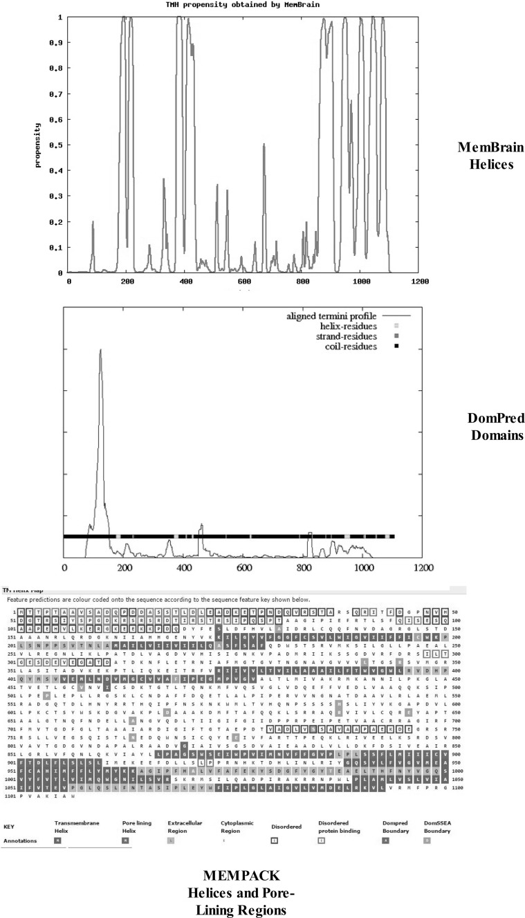 Fig. 7. Comparisons of the topology of TM helices (top graphic), protein domains (middle graphic), and disordered and pore-lining regions (lower graphic) of the Na/K-ATPase α-subunit of Beauveria bassiana (strain ARSEF 2860, White Muscardine disease fungus, #J5JMV7). Blue squares indicate predicted pore-lining regions and black squares, non-pore helix regions. Predicted TM helices are indicated in black. Blue squares indicate predicted pore-lining regions. Extracellular regions (membrane loops) are in orange. Disordered regions are indicated as open boxes outlined in either red (Disordered) or green (Disordered protein binding). See Methods for details