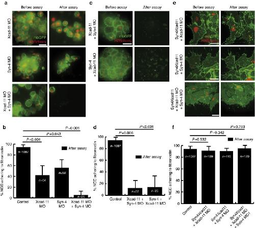 Figure 4. Synergistic function of Xcad-11 and Syn-4 in mediating cell-substrate adhesion.(a,c,e) NCC explants co-injected with mbGFP, H2Bcherry and indicated constructs before (right column) and after (left column) the flipping assay. (b,d,f) Statistics for flipping assays corresponding to a,c and e, respectively (mean±s.d.), n=total number of cells after flipping assay. Results of at least three independent experiments were averaged and statistical significance was analysed by Student's t-test. (a,b) Depletion of both Xcad-11 and Syn-4 leads to a dramatic loss of cellâsubstrate adhesion. (c,d) Neither co-injection of Xcad-11 nor Syn-4 rescues depletion of Syn-4 or Xcad-11, respectively. (e,f) Co-injection of chimera construct Syn4Xcad11 (Syn-4 EC domain and Xcad-11 TM as well as cytoplasmic domain) rescues cellâsubstrate adhesion in all NC morphant cells. Scale bars, 20âμm.