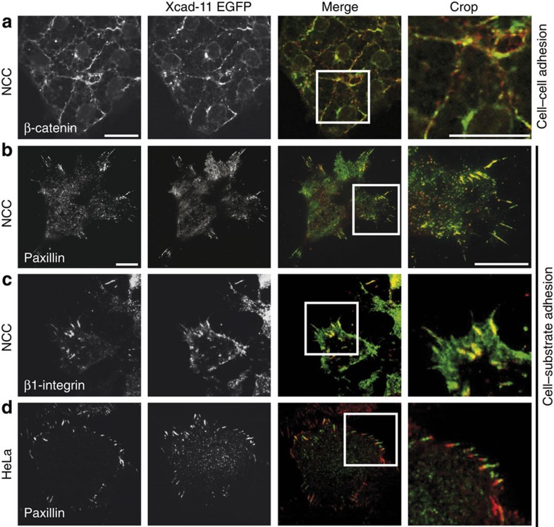 Figure 1. Xcad-11 is localized in focal adhesions.Xenopus NCC injected with Xcad-11-EGFP, explanted on fibronectin-coated glass dishes and immunostained for (a) β-catenin, (b) paxillin and (c) β1-integrin. (a) A confocal image focused on the apical side of NCC shows co-localization of Xcad-11 with β-catenin at cellâcell contacts. (b,c) TIRF images demonstrating co-localization of Xcad-11 with paxillin and β1-integrin in focal adhesions at the cell substrate. (d) HeLa cells transfected with Xcad-11-EGFP, immunostained for paxillin and imaged by TIRF microscopy display partial localization of Xcad-11 with paxillin at the cell substrate. Scale bars, 20âμm (a); 10âμm (bâd).