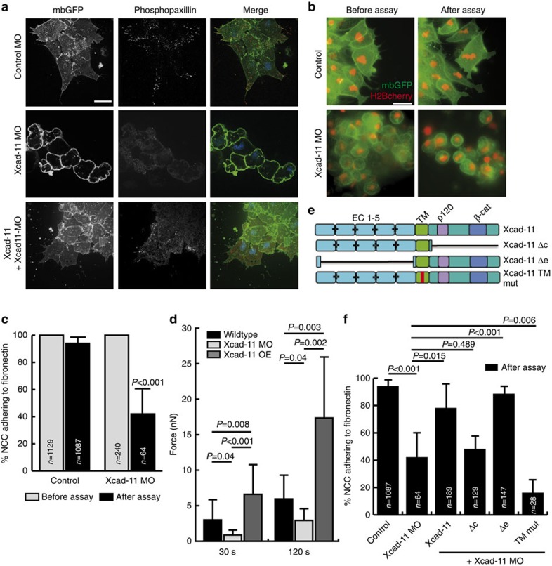 Figure 2. Xcad-11 promotes focal adhesion formation and cellâsubstrate adhesion.(a) NCC explants injected with mbGFP and immunostained for phosphopaxillin. Depletion of Xcad-11 by MO injection leads to loss of phosphopaxillin staining. (b) NCC injected with mbGFP and H2B-cherry or together with Xcad-11 MO. Fluorescence images collected at the same substrate position before (right column) and after (left column) the flipping assay. (c) Statistics for flipping assay (mean±s.d.), n=total number of cells before and after flipping assay. Results of at least three independent experiments were averaged and statistical significance was analysed by Student's t-test. (d) Adhesion forces (mean±s.d.) measured by AFM-based SCFS. At least 10 different cells were measured per condition and statistical significance was assessed according to the MannâWhitney test. (e) Xcad-11 constructs for reconstitution: extracellular (EC), transmembrane (TM); (p120/ β-cat) p120-binding or β-cat-binding site. (f) Statistics for reconstitution (mean±s.d.), n=total number of cells after flipping assay. Scale bars, 20âμm.