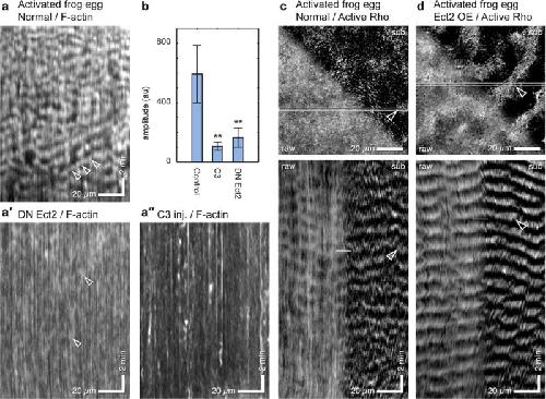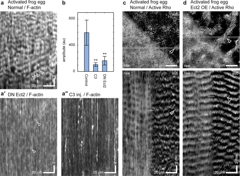 Figure 2. Cortical F-actin waves in activated frog eggs are Rho-dependent and are accompanied by Rho activity waves. (a) Kymograph from control activated frog expressing GFP-UtrCH to label F-actin; (a′) Kymograph from activated frog egg expressing GFP-UtrCH and dominant negative Ect2; (a″) Kymograph from activated frog egg expressing GFP-UtrCH and C3 exotransferase to inactivate Rho. Arrowheads indicate waves. (b) Plot of wave amplitude in controls versus cells expressing dominant negative Ect2 or C3. Results are mean ± SD; n=100 waves; p=0.00012 for C3 vs. control and 0.00015 for DN Ect2 versus control; t-test. (c) Activated frog egg expressing 3xGFP-rGBD to label active Rho (see Supplementary Video 4): single frame (top) and kymograph (bottom), raw (left) and subtracted data (right, t0–t−3), highlighting rising Rho activity. The kymograph demonstrates that what otherwise looks like mundane inhomogeneity in the still image actually reflects regular waves of Rho activity; these are more evident in the processed half of both the image and kymograph. (d) Activated frog egg expressing 3xGFP-rGBD to label active Rho and subjected to low-level overexpression of wild-type Xenopus Ect2 (see Supplementary Video 5); figure processed and presented as in 2c. Waves are sharper (i.e. have higher amplitude) and more continuous than normal cells (compare to 2c) and are clearly evident even without processing. 2c and 2d are derived from average projections of 4 1 micron sections at 10 sec intervals. Images are representative of at least 30 (a) 3 (a′, a″, b). 4 (c) and 6 (d)3–6 independent experiments, respectively. |