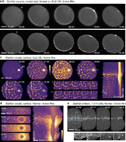 Figure 3. Rho activity waves in starfish oocytes and embryos. (a,b) Frames from time-lapse sequences of Rho activity during meiosis I in normal starfish oocyte (top; projection of 8 1 micron sections) and oocyte overexpressing wild-type S. purpuratus Ect2 (bottom; projection of 8 1.5 micron sections). See Supplementary Video 6. Arrow indicates animal pole. Rho activity appears at vegetal pole, spreads upward, and converges on nascent polar body, forming cytokinetic Rho zone. In Ect2-expressing oocytes the global pattern of Rho activity mirrors that of controls but waves are much brighter, travel further, and persist after polar body emission. (c) Surface view of cortical Rho activity in meiosis II oocyte overexpressing Ect2 (see Supplementary Video 7; pb = polar body; projection of 14 1 micron sections). High amplitude waves form and settle into repetitive, often spiral, patterns. Inset montages are successive 60 s time points from boxed region on left starting at 17:00 (1) or 18:36 (2), showing patterns that approximately replicate on ~ 70 sec time scale (1 is spiral, 2 is center-surround with a slash underneath). Kymograph on right generated from area indicated by outlined strip, 4th frame. Diagonal bands span half the oocyte, showing that waves travel at least this far. Horizontal lines in kymograph mark times of frames shown on left. Arrowheads point to wave front that traverses tens of microns at steady speed (d). Surface view of cortical Rho activity in normal starfish oocyte, single frames (left) and kymograph (right). Rho waves appear, brighten, and coalesce into continuous zone around nascent polar body (see Supplementary Video 8). Arrowheads indicate wavelet that appears in both kymograph and still frame. (e) Rho activity in normal starfish blastomere (1 of 4 cells), still frames and kymographs generated from strips outlined in blue: 1, furrow center; 2, furrow periphery; 3, just outside furrow; 4, across furrow. Rho waves focus at equator before ingression, appear in the furrow (arrows), and eventually merge into a coherent Rho zone. Asterisk indicates particularly bright focus that appears in 4th still frame and kymographs 1 and 4. Images are representative of 10 (a, d), 20 (b, c) and 4 (e) independent experiments, respectively. |