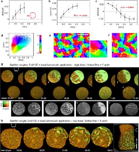 Figure 5. Analysis of Rho and F-actin dynamics reveals cortical excitability and spiral turbulence. (a) Rho activation rate (mean ± SD) increases with Rho activity signal indicating that Rho activates itself in a positive feedback loop. Correlation assessed from pixels with low F-actin signal (see Supplementary Figures 4a). (b) F-actin accumulation rate is positively correlated with Rho activity (assessed from pixels with low F-actin signal). (c) Rho activation rate is inversely correlated with F-actin signal, to the point of switching to inactivation at high F-actin density (assessed from pixels with high Rho activity signal). Results are mean ± SD; n=900 cycles. (d) Each cortical locus (image pixel) can be mapped by its particular values of Rho activity and F-actin density to a single phase value, an angle between 0 and 2π, shown in rainbow colors: Cortical loci at the front of waves appear green, loci at Rho wave crests as cyan, at F-actin wave crests as dark blue-magenta, and loci at the back of the wave are red and orange. (e) Phase reconstruction for starfish oocyte overexpressing Ect2 (Supplementary Video 13). Points where all rainbow colors (phase values) merge indicate spiral cores (arrowheads). Inset: magnification of spiral wave core neighborhood outlined by dashed line. (f) Phase reconstruction for activated frog egg overexpressing Ect2. (g) Meiotic Ect2-overexpressing starfish zygotes containing GFP-rGBD (Rho activity; malachite) and mCherry-Utr (F-actin; copper), time-lapse sequence after application of high concentration of LatB (10 uM) from agarose-filled pipette (position indicated by cartoon); treatment causes rapid cortical F-actin collapse and corresponding burst of Rho activation (see Supplementary Video 14). Insets: single channel images of cells/stages indicated by numerals: 1) initial response, 2) wave regime on far side, collapse on near side, 3) total collapse, 4) wave regime on near side of distant oocyte (h) Similar to (g), but low-dose (1 uM) LatB induces shift from typical Ect2-enhanced wave regime to higher-amplitude, longer-period wave regime, in which large scale Rho waves propagate away from site of local F-actin disassembly (see Supplementary Video 15); rightmost image is kymocube rendered using ImageJ. Images are representative of 5 independent experiments. |