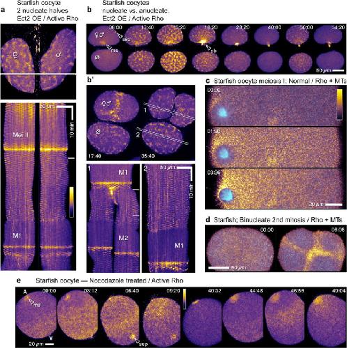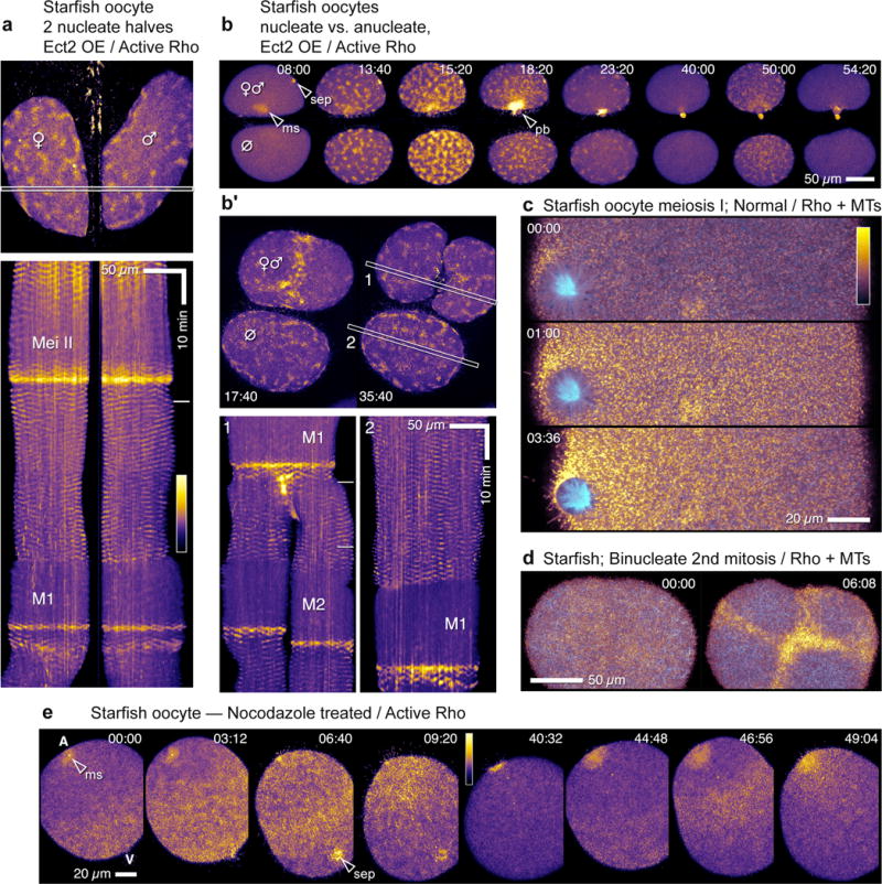 Figure 7. Excitability does not require spindles but is locally modulated by microtubules (a) Still frame (top) and kymograph (bottom) from time-lapse movie showing cortical Rho activity in two nucleate fragments derived from bisection of Ect2-overexpressing starfish oocyte. Waves of Rho activity appear and disappear in synchrony in each half. Pseudocolor table shown applies to a,b,b′, and e; in a and b′, outlined strips indicate kymograph region, dashes in kymographs are times of still frames. (b) Frames from time-lapse movie showing cortical Rho activity in nucleate half (top) and anucleate cytoplast (bottom) after bisection of Ect2-overexpressing starfish oocyte just before meiosis I. Waves appear and disappear on time in anucleate cytoplast in spite of the fact that it lacks spindle, chromosomes, or even centrosomes (see Supplementary Video 17) (b′) Similar bisection but after meiosis; two frames (top), during and after first cleavage, and kymographs (bottom, 1: nucleated, 2: anucleate). Cortical Rho waves appear and disappear in both halves, although first mitosis is delayed in the anucleate cytoplast. (c) Frames from time lapse movie showing microtubules (cyan) and active Rho (gold) in normal starfish oocyte during meiosis I. Rho activity is suppressed in the region occupied by spindle aster. (d) Frames from time lapse movie showing microtubules (cyan) and active Rho (gold) in starfish zygote with two spindles. Rho activity waves are excluded from regions occupied by spindle asters leading to focusing of Rho waves into cruciform Rho zone. (e) Meiotic Rho activity in normal starfish oocyte after treatment with 5 uM nocodazole to depolymerize microtubules (see Supplementary Video 18). The overall pattern of Rho activation is similar to controls – initiation at vegetal end, rapid progression to animal pole, inactivation in M-phase – except that animal pole is a Rho hotspot instead of a suppressed area; sep=sperm entry point, ms=meiotic spindle. Images are representative of 3(a, b), 12(c),17 (d) and 3(e) independent experiments, respectively. |