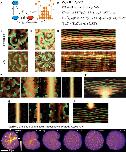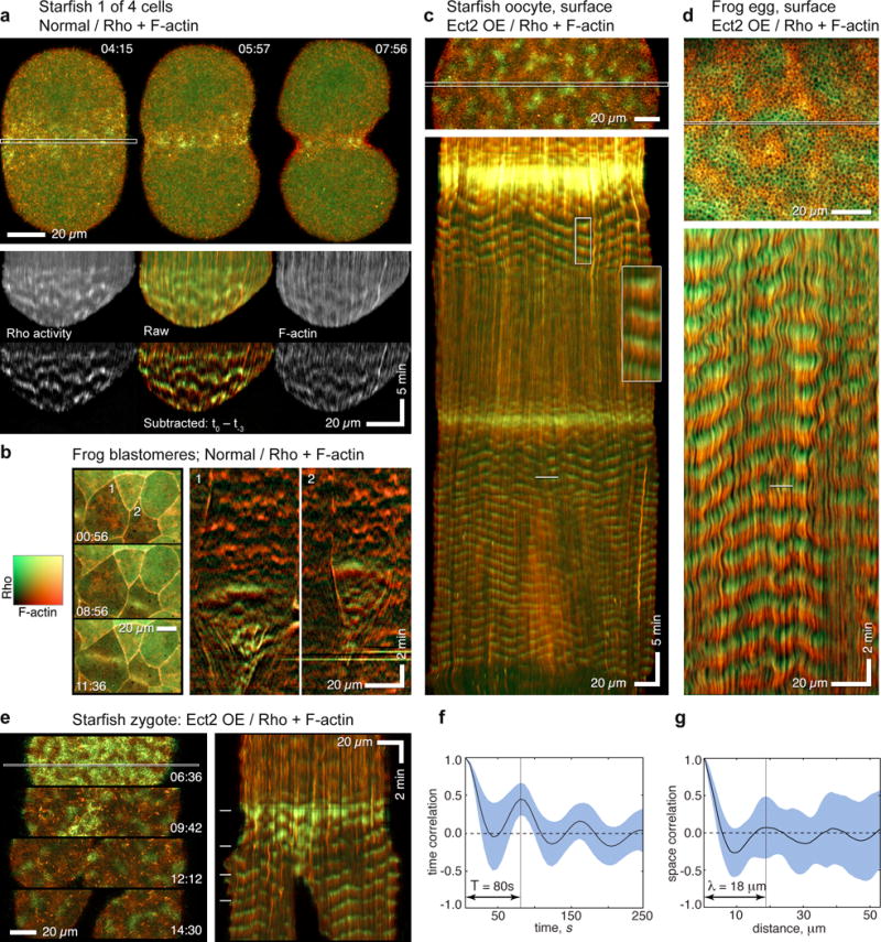 Figure 4. F-actin assembly fronts directly follow, but overlap minimally with, Rho activity waves. Color table shown in (b) applies to all images in this figure. (a) Normal starfish blastomere co-expressing GFP-rGBD (malachite; Rho activity) and GFP-Utr (copper; F-actin), selected frames (top) from time-lapse sequence of cytokinesis (Supplementary Video 9), and raw and subtracted kymographs (bottom) made from outlined strip. In still images, cytokinetic furrow is populated by apparently random densities of active Rho and F-actin; kymographs show these correspond to wavelets in which Rho activity rises, then falls as actin assembles. (b) Still images (left) and kymographs (right) from time-lapse movie of cortical F-actin and Rho activity in frog embryo showing two cells (1, 2) undergoing cytokinesis. Rho waves in furrow are followed by F-actin assembly waves. (c) Rho activity and F-actin in a starfish oocyte modestly overexpressing wild-type Ect2; kymograph (bottom) made from strip outlined in still frame (top). See Supplementary Video 10. Except during the global burst of Rho activity accompanying each meiotic cytokinesis, Rho activity waves immediately precede F-actin assembly, and F-actin disassembly precedes each Rho activation wave. Inset magnifies 4 cycles from wave train after first meiosis, emphasizing minimal overlap (yellow) between malachite and copper, and dark zone separating copper from next malachite wave. (d) Activated frog egg subjected to Ect2 overexpression, probes and presentation as in 4c (see Supplementary Video 11). Although waves are more tightly packed in frog eggs, kymographs show strikingly similar relationship between Rho and actin waves as in normal starfish. (e) Starfish zygote overexpressing Ect2 (see Supplementary Video 12), probes and presentation as in 4c and 4d, positions of still frames (left) indicated by dashes in kymograph (right). Faint waves precede global rise in Rho activity that focuses equatorially, leaving lower-amplitude waves in non-furrow regions; throughout, F-actin assembly follows peak Rho activity, and dark phases precede each Rho wave. (f) Temporal correlation plot of Rho waves from starfish oocytes overexpressing Ect2. Wave period ~80s. (g) Spatial correlation plot of Rho waves from starfish oocytes overexpressing Ect2. Wavelength 18 μm. Images are representative of 4 (a, b) 8 (c), or 5 (d) independent experiments, respectively. |