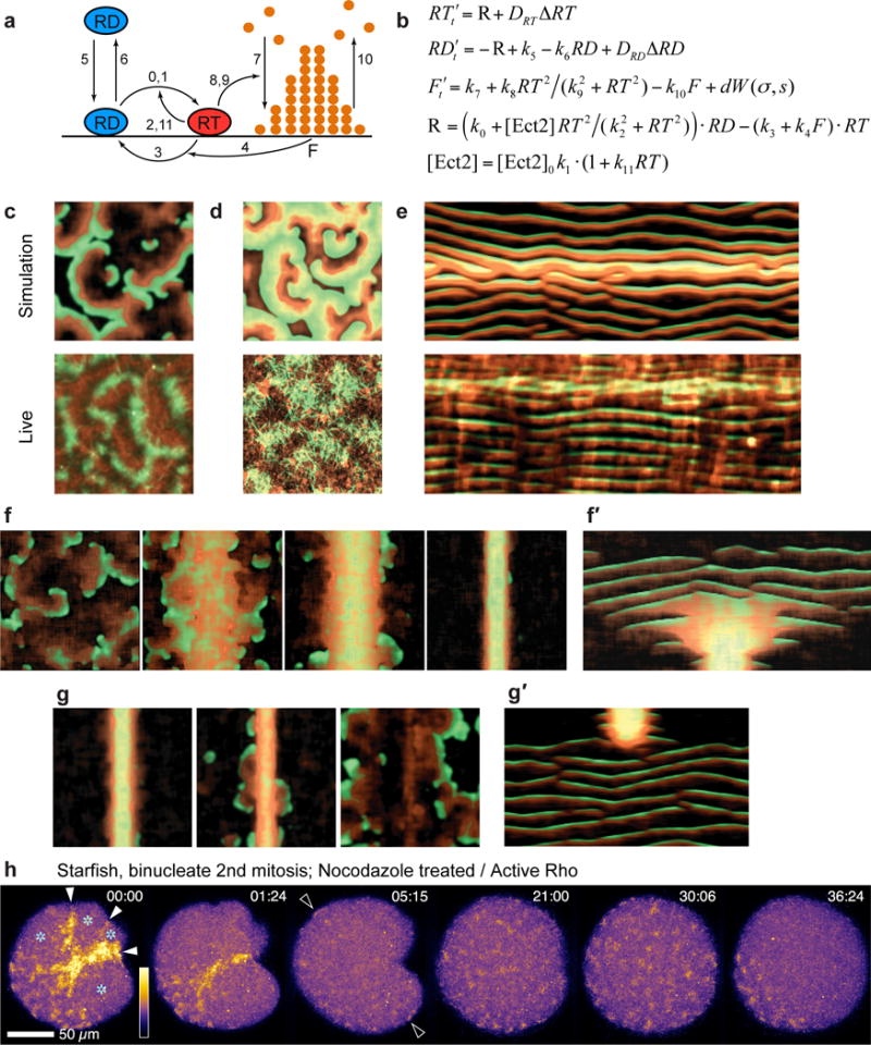 Figure 8. Model of excitable dynamics predicts that Ect2 spatio-temporal distribution determines the pattern of Rho-actin cortical activity. (a) Schematic diagram of the molecular processes described by the model (see Methods). Numbers on the arrows correspond to numbers of rate constants in b. (b) Model equations (see Supplementary Figure 6a and Methods). (c) Top: Simulation of wave turbulence with Ect2 level representing interphase wave pattern in starfish oocytes with extra Ect2 (see Supplementary Video 19), active Rho (malachite) and F-actin (copper). Bottom: image of cortical Rho (malachite) and F-actin (copper) from Ect2-overexpressing starfish oocyte for comparison. (d) Top: Model dynamics at the peak of global Ect2 activity – representing polar body emission phase – demonstrates a characteristic wave pattern with broad crests, substantial overlap of Rho and F-actin maxima and narrow refractory zones between wave crests (see also Supplementary Figures. 6b,c and Methods). Bottom: image of cortical Rho (malachite) and F-actin (copper) from Ect2-overexpressing oocyte at time of polar body emission for comparison. (e) Top: Model kymograph of Rho activity and F-actin prior to, during, and after polar body emission (see Supplementary Video 19). Bottom: experimental kymograph for comparison. (f) Emergence of furrow through condensation of waves in a simulation representing mitotic starfish cells with progressive focusing of Ect2 at the cell equator (see Supplementary Video 20). (f′) Kymograph along a line perpendicular to the furrow for model behavior in f. (g) Simulation of rapid microtubule depolymerization after furrow zone formation: furrow signal dissipates and spatially-homogeneous waves return. (g′) Kymograph of simulation shown in f. (h) Behavior of cortical Rho waves following experimental microtubule depolymerization by nocodazole in binucleate starfish zygote at the onset of cytokinesis. Cytokinetic Rho zones dissipate quickly and waves repopulate the entire cortex. Asterisks indicate spindle pole positions; solid arrowheads indicate Rho zones in nascent furrows; hollow arrowheads point out instances of cortical Rho waves in once-bare territory (see Supplementary Video 21). Images in h are representative of 3 independent experiments. |