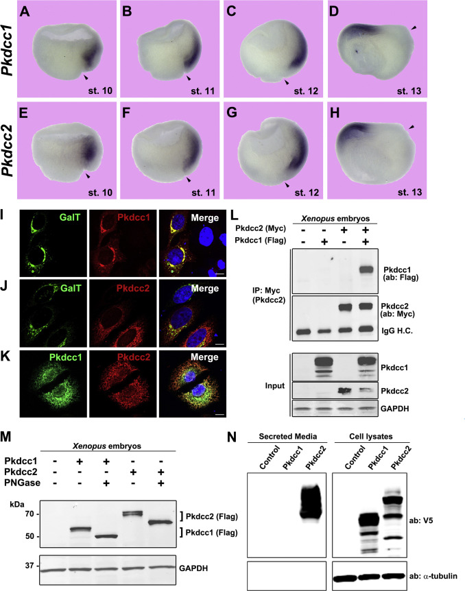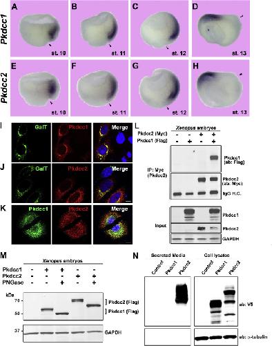 Fig. 5. Pkdcc1 and 2 are expressed in the Spemann organizer and localize to the Golgi apparatus. (AâH) Whole-mount in situ hybridization on hemisectioned Xenopus gastrula embryos showing Pkdcc1 and Pkdcc2 expression pattern from early to late gastrula (stage 10â13). Note the more anterior localization (in anterior endomesoderm) of Pkdcc2 compared to Pkdcc1 at stage 10. By the end of gastrulation Pkdcc1/2 expression was restricted to the prechordal plate. Arrowheads indicate dorsal lip position. (IâK) Immunofluorescence on HeLa cells overexpressing Pkdcc1-Flag and Pkdcc2-myc shows that the two kinases co-localize with the Golgi marker Galactosyl-Transferase (GalT). The two kinases also showed an overlapping subcellular localization. Nuclei were stained with DAPI (merge). Scale bars represent 10 µm. (L) Immunoprecipitation experiment showing physical interaction between Pkdcc1 and Pkdcc2 in Xenopus embryos. Pkdcc1-flag and/or Pkdcc2-myc mRNAs were injected at 4-cell stage and embryos were lysed at stage 12. One third of the total protein extract was saved and used as input. (M) Pkdcc1 and 2 are glycosylated, as shown by the electrophoretic mobility shift caused by PNGase F treatment. (N) Analysis of V5-tagged Pkdcc1 and 2 secretion in HEK293T cells showing that Pkdcc2 was found in the culture medium, indicating extensive secretion. |