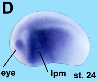 pkdcc.1 (protein kinase domain containing, cytoplasmic homolog, gene 1) gene expression in Xenopus laevis embryo, assayed via in situ hybridization, NF stage 24, lateral view, anterior left, dorsal up. |
