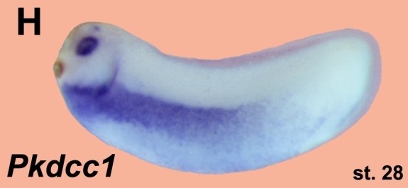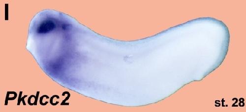 pkdcc.2 (protein kinase domain containing, cytoplasmic homolog, gene 2) gene expression in Xenopus laevis embryo, assayed via in situ hybridization, NF stage 28, lateral view, anterior left, dorsal up. |
