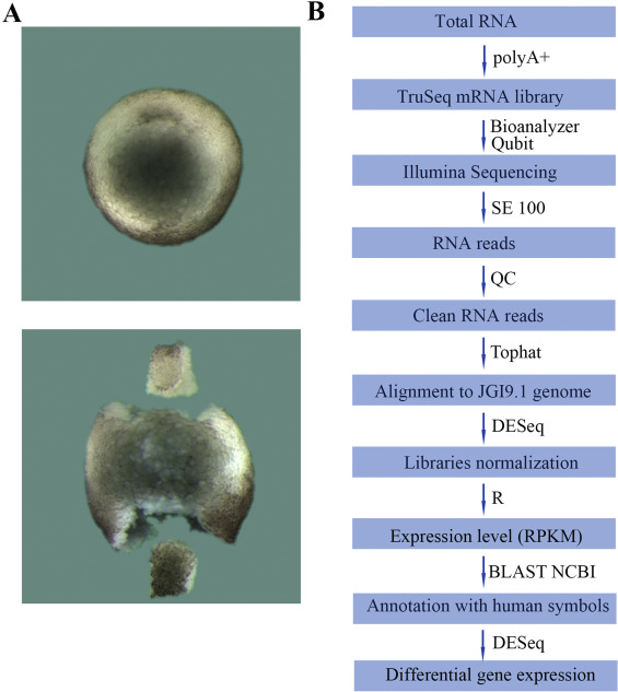 Fig. 1. DâV dissections and experimental flowchart. (A) Dorsal and ventral lip dissection. The upper panel shows a wild-type stage 10.5 Xenopus embryo, while the lower panel shows dorsal (Dlip, top) and ventral lips (Vlip, bottom) dissected from a sibling stage 10.5 embryo. (B) Outline of the RNA-seq analysis pipeline described in materials and methods. |