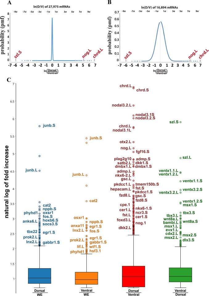 Fig. 2. Distribution of transcripts sequenced from dorsal and ventral lips. (A) Curve showing normal distribution of fold change of dorsal transcripts. The curve was created using 27,594 mRNAs obtained from the first experiment after selecting for abundance of expression; the ordinate indicates the probability that a gene is located in the curve by chance (probability mass function). Genes were organized by the dorsal/ventral natural logarithm, providing dorsal genes with positive values, while assigning negative numbers to ventral genes. (B) A normal Gaussian curve was obtained by artificially removing about 11,000 transcripts expressed at similar levels in both dorsal and ventral lips. The graph indicates that the data obtained was evenly distributed throughout both dorsal and ventral lips and defined the standard deviation. The most dorsal gene was Chordin, 9 standard deviations above the mean, while the most ventrally expressed gene was Sizzled, 8 standard deviations above the mean. (C) Box and whisker plots reveal transcripts upregulated upon bisection of dorsal (Dorsal/WE) or ventral (Ventral/WE) lips compared to uncut wild type whole embryos (WE), and dorsal and ventral transcriptomes (Dorsal/Ventral and Ventral/Dorsal). Only some of the outliers above the whisker are annotated, with Short on the right and Long subgenome genes on the left. Chordin is referred to by its abbreviation chrd in this Figure and throughout the Supplementary Tables and Xnr3 in the main text is referred to as nodal 3 here. Note that cutting the embryo triggers the expression of injury response genes in both fragments. |