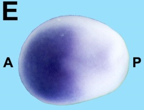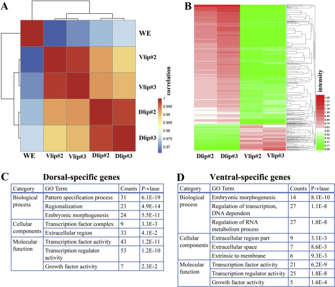 Fig. 3. The DâV transcriptomes obtained by RNA-seq are highly reproducible. (A) Correlation plot of duplicate dorsal and ventral lip RNA-seq experiments from different egg clutches shows high reproducibility of the method. The correlation scores were calculated as the Pearson Correlation Coefficient (PCC) and color-coded as shown in the scale bar on the right of the panel. Note that Vlip and Dlip samples clustered into groups based on PCC. (B) Heatmap of differentially expressed genes between dorsal and ventral lip libraries. The expression data (RPKM) of each gene across different samples was scaled and represented as z-scores. The expression levels (expressed as logarithm of RPKM) are indicated in the scale bar on the right panel. (C) Table showing the top gene ontology (GO) terms associated with dorsal-specific genes. (D) Table of GO terms for ventral-specific transcripts. |
