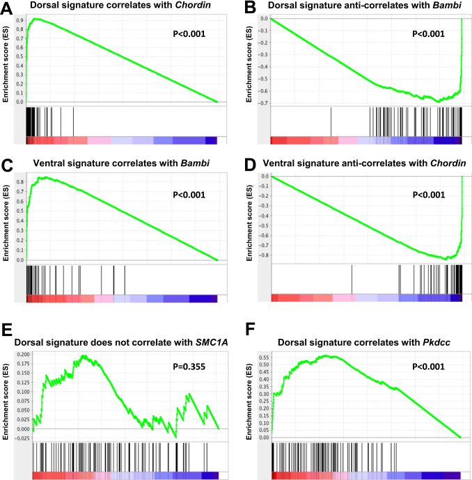 Fig. 4. Gene Set Enrichment Analysis (GSEA) of dorsal and ventral gene signatures. (AâB) The dorsal gene signature (comprised of 107 genes) positively correlated with Chordin (P<0.001), a Spemann organizer marker, and negatively correlated (or anti-correlated) with BAMBI (P<0.001), a marker of ventral tissues. (CâD) The ventral signature (which contains 70 genes) positively correlated with BAMBI (P<0.001), while it negatively correlated with Chordin (P<0.001). (E) SMC1A, used here as a negative control, did not correlate with the dorsal (P=0.355) nor the ventral (not shown) signature. (F) Pkdcc, a novel dorsal gene described here, significantly correlated with the dorsal gene signature (P<0.001). |