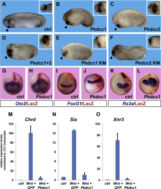 Fig. 6. Overexpression of Pkdcc enlarges anterior tissues and inhibits canonical Wnt signaling. (AâC) Overexpression of 1 ng of Pkdcc1 or Pkdcc2 mRNA caused expansion of anterior structures such as the cement gland (see insets). Percent of embryos showing enlarged cement gland and head were 0% n=60 for controls; 81% n=54 for Pkdcc1; 84% n=38 for Pkdcc2. (D) This effect is synergistic, since injection of 500 pg each of Pkddc1 and 2 caused an even greater enlargement of the cement gland (98% of the embryos showed this phenotype, n=50). (EâF) Kinase mutant (KM) forms of Pkdcc1 and 2 also caused an increase of cement gland tissues, suggesting that the kinase activity is dispensable for Pkdcc-mediated anteriorizing effects. Percent of embryos showing enlarged cement glands were: 82% n=27 for Pkdcc1-KM; 83% n=24 for Pkdcc2-KM. All embryos are shown from lateral views, insets show ventral view of the cement gland from the same embryos. Arrowheads point to cement gland. (GâL) Whole-mount in situ hybridizations for anterior neural markers show that Pkdcc1 mRNA overexpression expands Otx2,FoxG1 (also known as BF1) and Rx2a. The injected side was identified through Red Gal staining of the lineage tracer nuclear Lacz (nLacz) coinjected with Pkdcc1. Control embryos were injected with nLacz only. Percentage of Pkdcc1-injected embryos showing expanded neural markers: Otx2 66% n=27; FoxG1 76% n=47; Rx2a 92% n=38. (MâO) Pkdcc1 abolishes canonical Wnt signaling. Quantitative RT-PCR analysis performed on animal cap explants co-injected with xWnt8 and Pkdcc1 mRNAs shows that Pkdcc1 greatly reduces induction of canonical Wnt target genes Chordin (Chrd), Siamois (Sia) and Nodal related 3 (Xnr3). GFP mRNA was used as a negative control. Transcript levels of the housekeeping gene ODC were used for normalization. Error bars indicate standard deviations derived from three independent experiments. |
