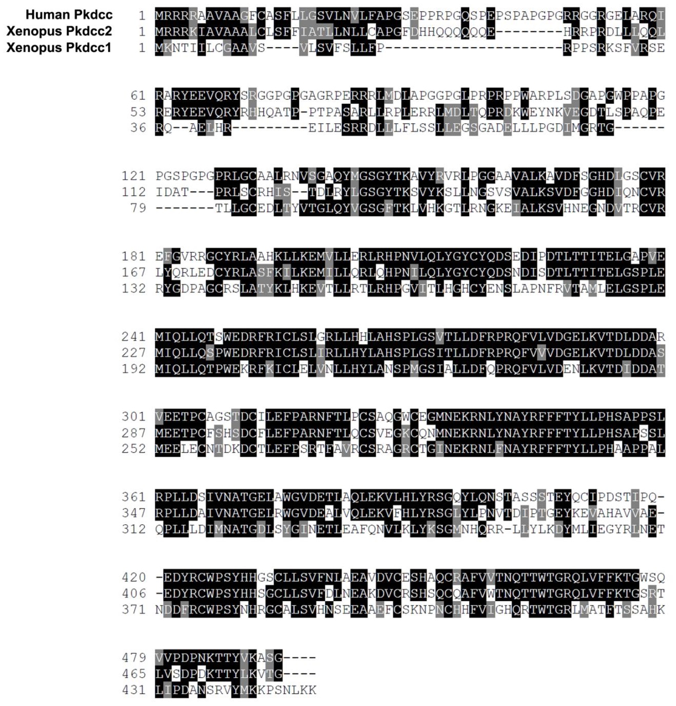 Fig. S1. Xenopus Pkdcc1 and 2 are homologous to mammalian Pkdcc. Amino acid comparison between human Pkdcc and the two Xenopus ortholog proteins. The multiple alignment of amino acid sequences was generated using ClustalOmega software (http://www.ebi.ac.uk/Tools/msa/clustalo/) and processed with BOXSHADE (http://www.ch.embnet.org/software/BOX_form.html). The black and grey shaded boxes indicate identical and similar amino acids, respectively. |