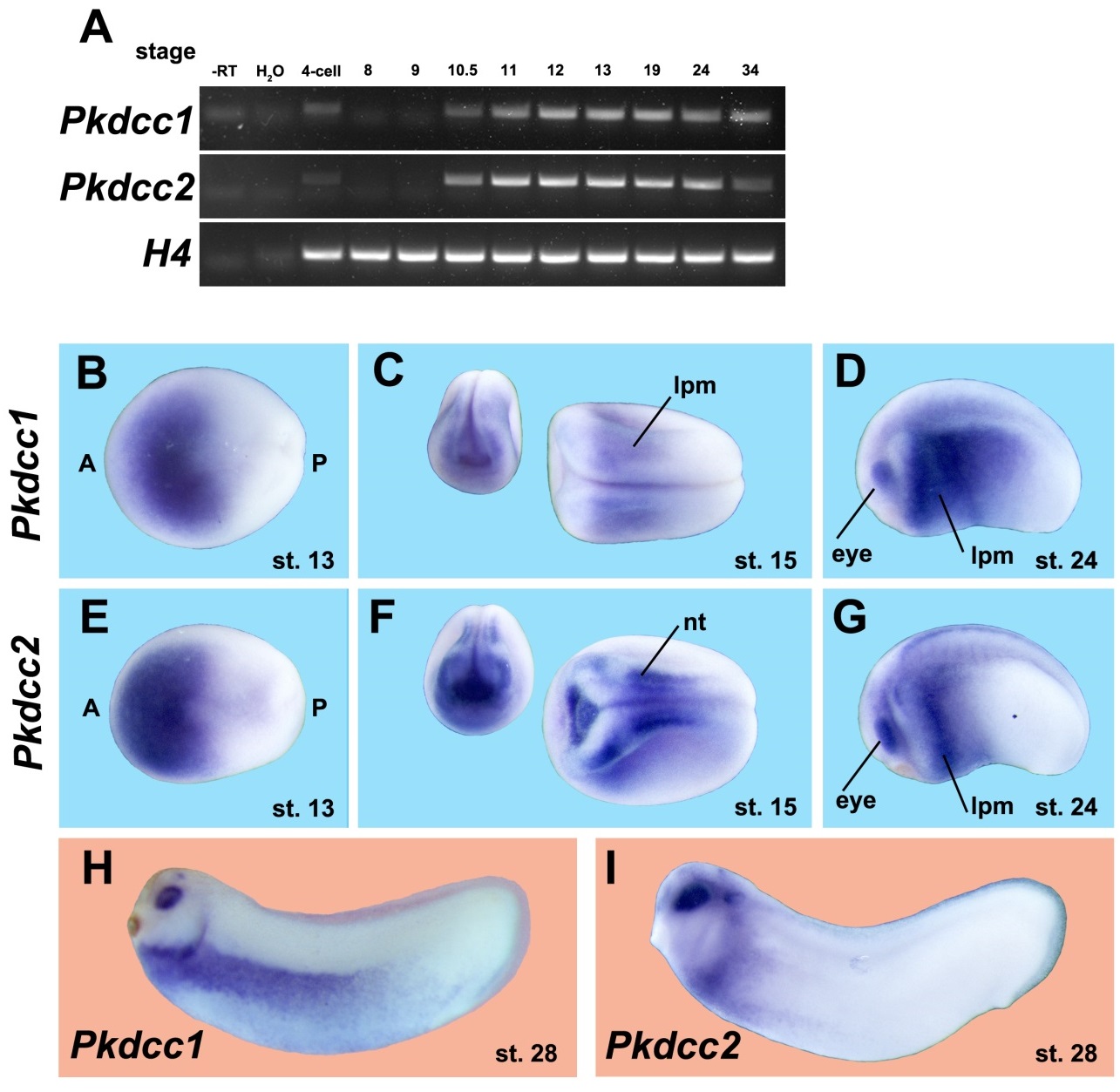 Fig. S2. Temporal and spatial expression analysis of Pkdcc1/2. (A) Total RNA was obtained from Xenopus laevis embryos at different stages of development and analyzed by RT-PCR. Strong Pkdcc1/2 expression was observed from early gastrula stage (stage 10.5) until tailbud stages. Faint maternal expression was observed at 4-cell stage. Histone 4 (H4) was used as a loading control. H2O and âRT samples are used as negative controls. (B-I) Whole-mount in situ hybridization of Pkdcc1 and 2 at post-gastrula stages showed strong expression in the anterior part of the embryo at stage 13. At stage 15, expression was observed in the lateral plate mesoderm (Pkdcc1) or in the neural tube (Pkdcc2). At stage 24 and 28, robust expression was mainly found in the eye and in the lateral plate mesoderm, with Pkdcc2 lateral plate mesoderm expression being more anteriorly restricted. Abbreviations: lpm, lateral plate mesoderm; nt, neural tube; a, anterior; p, posterior. |