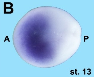 pkdcc.1 (protein kinase domain containing, cytoplasmic homolog, gene 1) gene expression in Xenopus laevis embryo, assayed via in situ hybridization, NF stage 13, dorsal view, anterior left. |