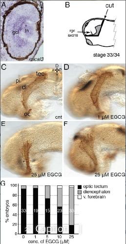 Figure 1- EGCG impairs optic tract development. A: mical3 mRNA as assessed by in situ hybridization is expressed in the ganglion cell (gcl) layer and lens (ln) of the eye of a stage 35/36 X. laevis embryo. B: Schematic showing the brain exposure and the position of the leading RGC axons (arrow) at the time of exposure. CâF: Anterogradely HRPâlabeled (brown) RGCaxon tracts in X. laevis brains exposed to control or EGCG solutions between stage 33/34 and stage 40. G: Graph of the percentage of embryos with optic tracts that reached the optic tectum (optic tectum), failed to navigate the turn in the diencephalon (diencephalon), or arrested in the ventralforebrain (v. forebrain) in control and EGCG exposed conditions. di, diencephalon; gcl, ganglion cell layer; ln, lens; oc, optic chiasm; pi, pineal gland; tec, optic tectum. The number of embryos examined under each condition is presented within the bars in G, and are pooled from at least three independent experiments.