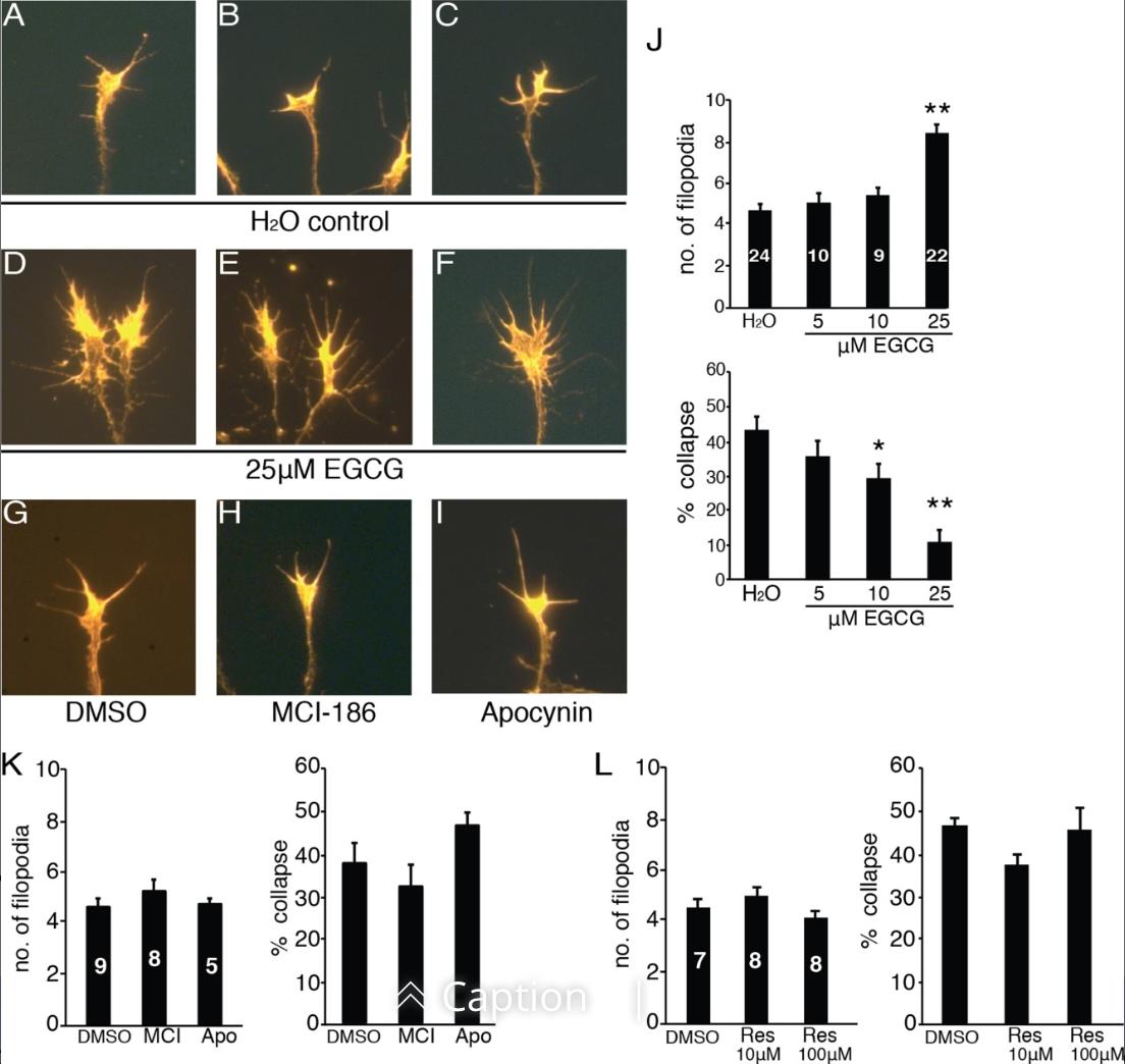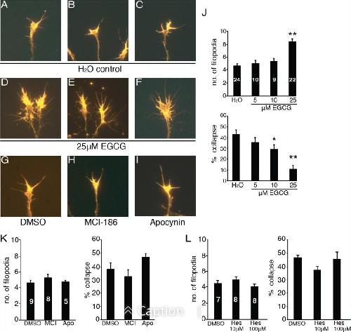 Figure 2-EGCGâtreatment in culture increases filopodial numbers. AâI: Representative images of phalloidinâlabeled RGC axons exposed to control H2O (AâC), 25 μM EGCG (DâF), DMSO (G), 400 μM MCIâ186 (H), and 200 μM apocynin (I) solutions. JâL: Graphs depicting the average number of growth cone filopodia and the percentage of collapsed growth cones for each treatment group. Conditions are indicated beneath each bar. The number of explants analyzed is presented within each bar, a minimum of two separate experiments were performed for each condition. Analysis: In J, a oneâway ANOVA indicated a main effect of treatment for number of filopodia (F(3,61) = 22.4; P < 0.01) and percentage collapse (F(3,61) = 22.3; P < 0.01). Post hoc analyses using the Dunnett test revealed a significant difference in number of filopodia in the 25 μM EGCG group (P < 0.01) and percentage collapse in the 10 μM (P < 0.05) and 25 μM (P < 0.01) EGCG groups when compared with controls. In K, a oneâway ANOVA indicated no effect of treatment for number of filopodia (F(2,19) = 1.76; P = 0.20) and percentage collapse (F(2,19) = 0.96; P = 0.40). In L, a oneâway ANOVA indicated no effect of treatment for number of filopodia (F(2,20) = 1.54, P = 0.24) and percentage collapse (F(2,20) = 2.19; P = 0.14). Data are mean ± SEM. ** P < 0.01, and * P < 0.05.