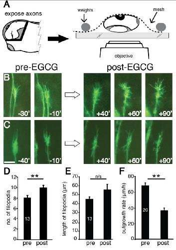 Figure 3-EGCG increases filopodial number and decreases rate of outgrowth of RGC axons in vivo. A: Schematic illustrating the approximate position of RGC axons during the recording period, as well as the mounting and imaging technique. Developing GFPâpositive axons were exposed and embryos were anchored exposedâside down in a glass bottom dish for imaging with an inverted fluorescent microscope. B,C: The development of GFPâlabeled RGC growth cones was monitored by time lapse image capture in vivo before and after the addition of EGCG to a final concentration of 25â50 μM. The time, in min, relative to the addition of EGCG is indicated in the lower right corner of each image. DâF: Graphs representing the number of filopodia per growth cone, the cumulative length of the filopodia on each growth cone, and the rate of outgrowth before and after the addition of EGCG. Number of axons tracked are presented within each bar. Analysis: A paired samples tâtest was used for all comparisons. For number of filopodia, P < 0.01; for cumulative length of filpodia, P = 0.7; for outgrowth rate, P < 0.01. Scale bar = 10 μm in C. Data are mean ± SEM. **P < 0.01.