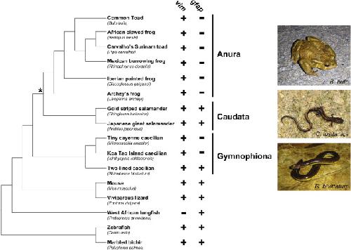 Fig. 8. Schematic representation of the evolutionary relatedness of species in the survey for gfap and vim genes. Orders for amphibian species are indicated. Asterisk illustrates last common ancestor shared by Anura and Caudata. + and â indicate presence or absence of indicated gene in the PCR surveys, respectively. Photo credits: B. bufo, R. bivittatum (DSM), C. lusitanica (Benny Trapp: https://commons.wikimedia.org/wiki/User:Benny_Trapp). |