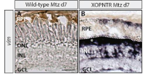 Fig. S15. Vim expression in the subretinal space after rod ablation. Wild-type (A) and XOPNTR (B) stage 50 tadpoles were treated for seven days with Mtz. Retinal sections were stained by in situ hybridization for vim expression and then bleached with hydrogen peroxide to clear RPE pigment. White dashed lines in both panels mark the boundary between RPE and photoreceptors. White asterisk in B labels vim expression in the subretinal space in response to rod ablation. Scale bar, 50 µm. |