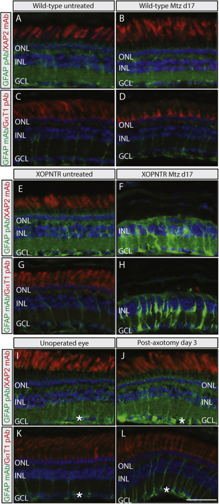 Fig. 1. GFAP-like immunolabeling in the normal and injured X. laevis retina. Retinal sections of wild-type (A-D, I-L) and XOPNTR transgenic (E-H) tadpoles were co-stained with GFAP pAb and XAP2 mAb (A, B, E, F, I, J) or GFAP mAb and GαT1 pAb (C, D, G, H, K, L). Green fluorescent secondary antibodies were used to visualize GFAP antibody staining, while red fluorescent secondary antibodies detect XAP2 (unknown epitope) and GαT1 (Transducin) antibodies, which stain rod photoreceptors. Wild-type controls and XOPNTR transgenic tadpoles were treated for 17 days with either DMSO-alone (A, C, E, G) or Mtz (B, D, F, H) to ablate rod photoreceptors. Retinal sections of wild-type tadpoles were stained three days following retinal axotomy. The left, unoperated eyes (I and K) are compared to the right, operated eyes (J and L) of the same animals. Hoescht (blue) stains nuclei of the ONL, INL and GCL, which are the outer nuclear, inner nuclear, and ganglion cell layers (asterisks in I-L), respectively. Scale bar=25 µm. |