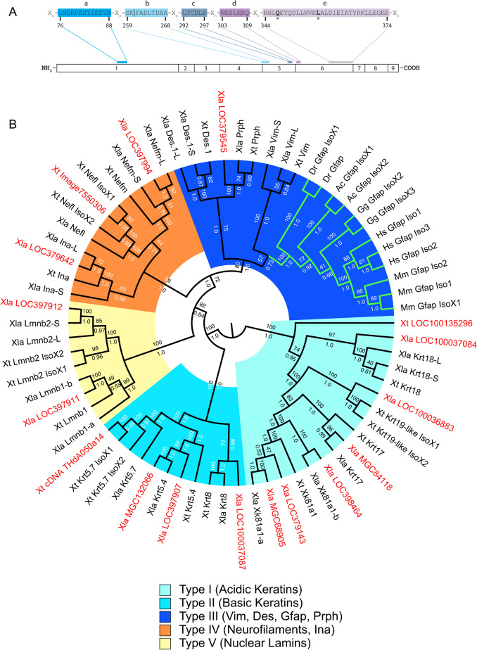 Fig. 2. Sequences most similar to GFAP in Xenopus. (A) GFAP consensus used to distinguish candidate GFAP sequences from other intermediate filament proteins. Conserved regions (labeled aâe) are present in all GFAP orthologs identified and separated by regions of varying length (Xn). The gfap exon in which each region is coded is shown. The numbering system below the consensus is for human GFAP Isoform 1 (NP_002046). All residues shown are invariant in the GFAP orthologs aligned ( Fig. S1). The residues (*) at positions 347 (Q) and 357 (L) are unique to GFAP. Consensus region b is coded for in two exons (4 and 5). Vertical line (|) demarcates sequence coding for exons 4 and 5. (B) Cladogram of GFAP orthologs, Xenopus IFPs and untitled Xenopus proteins with similarity to GFAP. Midpoint rooted RAxML Polar Tree based on MAFFT alignment of GFAP orthologs, selected known X. laevis and X. tropicalis IFPs and the 17 untitled X. laevis and X. tropicalis sequences showing greatest similarity to GFAP ( Katoh and Standley, 2013). Untitled X. laevis (Xla) and X. tropicalis (Xt) sequences are shown in red. Green branches show location of the GFAP clade. Groupings of IFP types are shown. Maximum likelihood bootstrap (above) and Bayesian inference posterior probabilities (below) for each branch are included ( Felsenstein, 1981 and Huelsenbeck et al., 2001). Accession numbers for each sequence in the tree can be found in Supplementary Table S2. |