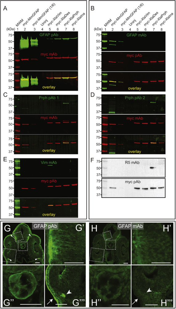 Fig. 4. Specificity of intermediate filament protein antibodies. Western blots were used to determine the specificity of GFAP pAb (A), GFAP mAb (B), Prph pAb 1 (C), Prph pAb 2 (D), Vim mAb (E), and R5 mAb (F). Extracts were prepared from embryos injected with mRNA coding for the indicated myc-tagged IFP. Blots were probed with the indicated combination of primary antibodies. Green fluorescent secondary antibodies were used to detect the IFP and myc primary antibodies, respectively (A-E). Red fluorescent signals were pseudocolored to make visualization easier. Merged images indicate myc-IFP proteins detected by both antibodies (AâE, yellow). Enhanced chemiluminescence was used to test the specificity of the R5 mAb and myc pAb (F). One-sixth the volume of extract from myc-MmGFAP expressing embryos in lane 2 was used in lane 3. Immunohistochemistry was use to compare the staining pattern of the GFAP pAb (G-Gâ²â²â²) and GFAP mAb (H-Hâ²â²â²) in sections of stage 35/36 X. laevis embryos. Gâ²/Hâ², Gâ²/Hâ² and Gâ²â²â²/Hâ²â²â² show magnified views of the brain, notochord and retina, respectively. Arrow and arrowheads, indicate the location of skin epidermis and ocular motorneuron projections dorsal and ventral to the optic cup, respectively. Scale bar, 50 µm. |