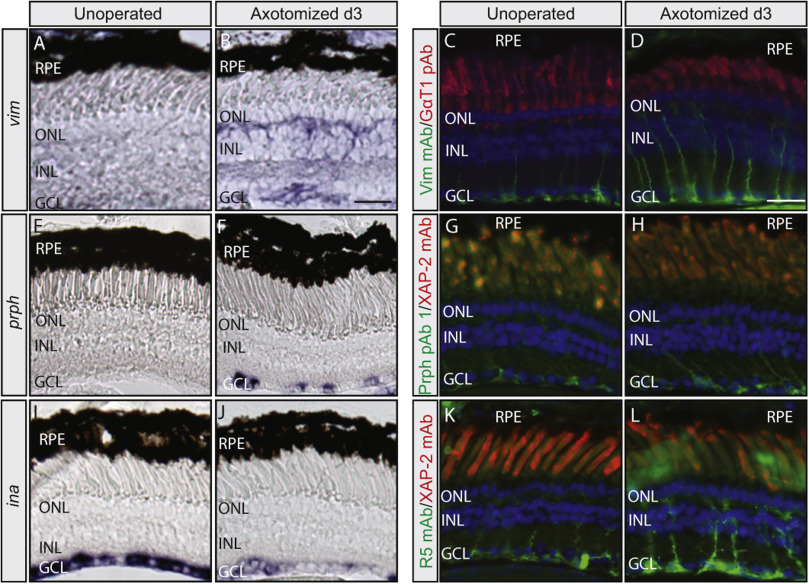 Fig. 7. Retinal expression of intermediate filament proteins after retinal ganglion cell axotomy. vim (A and B), prph (E and F), and ina (I and J) in situ hybridization on retinal sections from control unoperated (A, E, and I) and operated (retinal axotomy) (B, F, and J) eyes. Vim mAb (C and D), Prph pAb 1 (G and H), and R5 mAb (K and L) immunolabeling of retinal sections from control (C, G, and K) and operated (D, H, and L) eyes. Rod photoreceptors were labeled with either GαT1 (Transducin) pAb (C and D) or XAP-2 mAb (G, H, K, and L). Sections were counterstained with DAPI to visualize nuclei. Scale bars, 50 µm. |