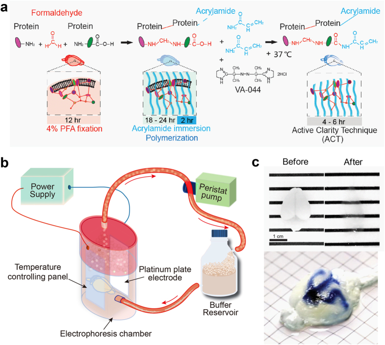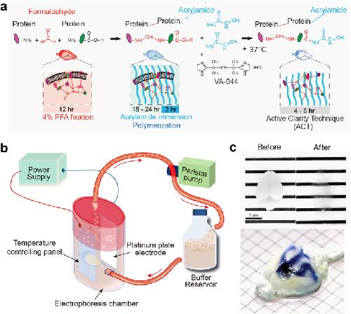 Figure 1. Active Clarity Technique (ACT) is a rapid and efficient whole-brain clearing technique. (a) Workflow for clearing tissue with the ACT. The brain was isolated from a cardiac-perfused animal and post-fixed in 4% paraformaldehyde (PFA) overnight to induce DNA-protein crosslinking. The brain was immersed in a 4% acrylamide and thermal initiator-containing solution for 18–24 hours. The whole brain was incubated at 37 °C for 2 hours. After polymerization, lipid membranes were removed by ACT for 4–6 hours. (b) Diagram of the ACT-ECT system. (c) Brains before (left) and after (right) ACT processing; C57BL/6 mouse brains after polymerization, ACT, and refractive index matching. Scale bar, 1 cm. Injection of trypan blue into the ventricle of a cleared brain (bottom). Square unit; x: 5 mm, y: 5 mm. |