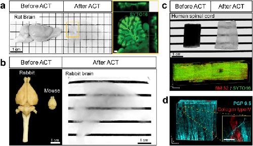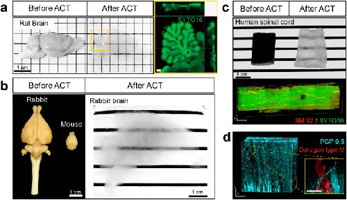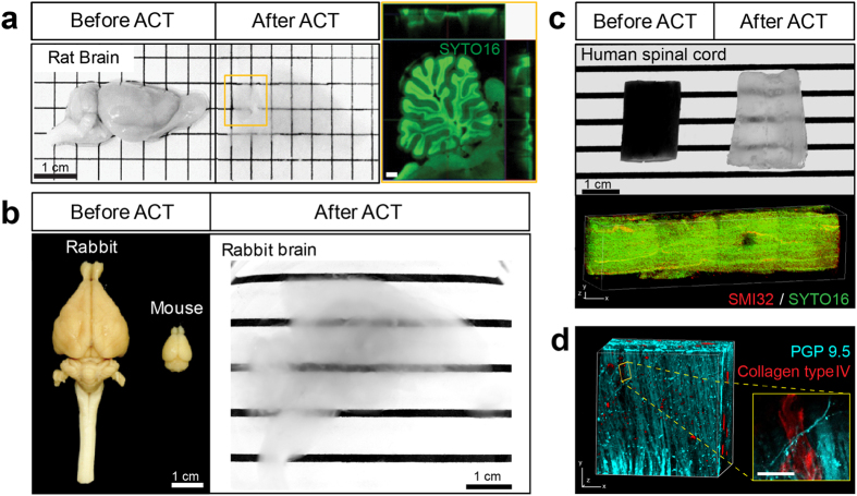 Figure 3. Scalability of the Active Clarity Technique (ACT).(a) Rat brain hemisphere processed with 15âhours of ACT. Scale bar, 1 cm. (Right) Magnified fluorescent image of the boxed region in the middle (yellow). Nuclear-staining (SYTO16) of rat cerebellum (4âÃâ4 tile scan with the Fluar 5âÃâobjective; stack size, 2,580âμm; stack step, 20âμm) acquired with the LSM 700 microscope. Scale bar, 1 mm. (b) Size comparison of an adult mouse brain and an adult rabbit brain (left). The rabbit brain was cleared after 36âhours of ACT (right). (c, d) Human spinal cord block cleared with ACT and immunolabeled. (c) Before and after ACT. Scale bar, 1âcm. Human spinal cord block (1.3â1.5âcm thick) was cleared (100âhours of ACT) and stained with SMI32 (red). SYTO16 (green) was used for nuclear staining (1.1âÃâconfocal zoom; stack size, 1,020âμm; stack step, 1âμm). (d) Spinal cord block was immunostained for PGP 9.5 (cyan) and collagen type IV (red) (2âÃâconfocal zoom; stack size, 420âμm; stack step, 5âμm). All three-dimensional reconstructed images were obtained with a Zeiss 780 (c) or 700 (d) confocal microscope with a Plan-apochromat 10âÃ/0.45 M27 lens. Scale bar, 50âμm. |