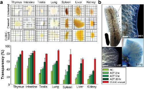 Figure 4. Active Clarity Technique (ACT) for whole-organ clearing and immunolabeling. (a) Cleared organ samples (thymus, intestine, testis, lung, spleen, liver, and kidney) were treated with CUBIC-mount for 5 days to adjust the refractive indices of the tissue and reagent. Square units; x: 5 mm, y: 5 mm. (b) Transmission images of cleared whole organs (liver, lung, kidney, and spleen) by ACT. Images were taken after electrophoretic tissue clearing (ETC) in PBS. Details of the tissue architecture were visualized with a standard dissection microscope. Images were acquired on an Olympus BX53 digital microscope DP73 camera. Scale bar, 1 mm. |