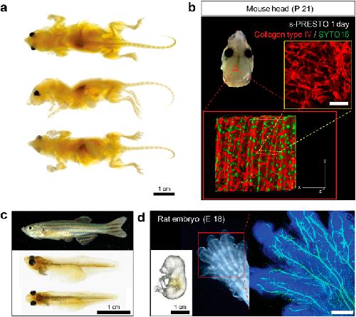 Figure 6. Whole body clearing of various organisms using the Active Clarity Technique (ACT).(a) Whole mouse body (3-weeks-old) was cleared in 24 hours using the ACT. After 3 days of incubation in CUBIC-mount solution, the ACT-processed mouse whole body became optically transparent and could be imaged without sectioning. Scale bar, 1 cm. (b) Image shows collagen type IV-labeled extracellular matrix (ECM) within the skull and underlying meninges. Images were obtained with a Zeiss 700 confocal microscope with a Plan-apochromat 10 ×/0.45 M27 lens, 2 × confocal zoom (stack size, 320 μm; stack step, 5 μm). Scale bar, 100 μm. (c) Comparison of optical transparency of whole zebrafish body before and after ACT clearing. Scale bar, 1 cm. (d) Whole rat embryo body (embryonic day 18) was cleared by the ACT. Scale bar, 1 cm. Embryo labeled with TrkA antibody shows the details of TrkA innervation in the foot. Imaged obtained with a Zeiss 700 confocal microscope with a Plan-Neofluar 5 ×/0.15 objective, 0.7 × confocal zoom (maximum projection; stack size, 1,250 μm; stack step, 15 μm). Scale bar, 500 μm. |