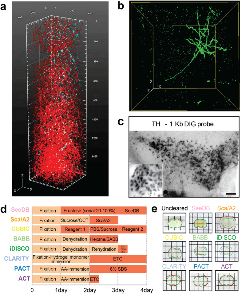 Figure 2. Active Clarity Technique (ACT) for three-dimensional imaging of protein and RNA distribution in adult brain samples.(a) Unsectioned mouse brain tissue image showing part of the midbrain stained with tyrosine-hydroxylase (20âÃâobjective; stack size, 1,580âμm; step size, 2âμm). Scale bar, 100âμm. (b) Neurons labeled with the adeno-associated virus-green fluorescent protein (AAV-GFP) and immunolabeling of dendritic arbors with anti-GFP antibodies (10âÃâobjective, 0.7âÃâconfocal zoom; stack size, 1,180âμm; step size, 2âμm). Scale bar, 100âμm. (c) In situ hybridization of ACT-processed midbrain slice with 1.1 Kb DIG-labeled tyrosine hydroxylase (TH) probes. Scale bar, 100âμm. (d) Comparison of procedures and processing times between ACT and other clearing methods. (e) Images of brain blocks (1-mm thick) after processing. Dotted green lines indicate original sizes of blocks and red lines mark sizes after clearing. Square unit; x: 5 mm, y: 5 mm. |