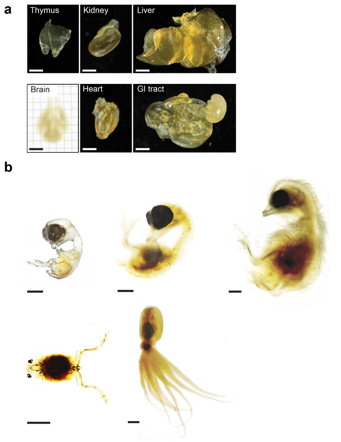 Supplementary Figure 6. Active Clarity Technique (ACT) is applicable to whole organisms (a)Whole organs were collected from 2 dayACT-processed whole mouse bodies. Scale bar, 1 cm. (b) Vertebrate and invertebrate model animals, such as chickens, Xenopus, and the small octopus were cleared by the ACT. Scale bar, 1 cm (see Supplementary Table 4 for ACT conditions and times). |
