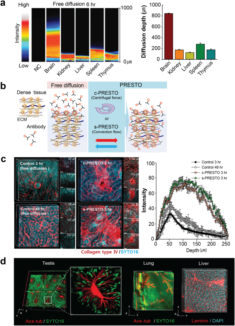 Figure 5. ACT-PRESTO (active clarity technique-pressure related efficient and stable transfer of macromolecules into organs) for rapid immunolabeling of dense tissues.(a) Comparison of diffusion rate using ACT-processed organs. (b) Schematic diagram for dense tissue immunohistochemistry. Tissues for centrifugal PRESTO (c-PRESTO) were centrifuged at 600âÃâg for 3âhours using a standard table-top centrifuge to expedite penetration of the primary and secondary antibodies. A syringe pump was used for the antibody reaction during syringe PRESTO (s-PRESTO). (c) Kidneys were labeled with collagen type IV using various protocols. Note that 3âhours of c- or s-PRESTO markedly enhanced the depth of specific labeling compared to that of the controls. Three-dimensional (3D) reconstructed images were obtained with a Zeiss 700 confocal microscope with a Plan-apochromat 10âÃ/0.45 M27 lens, 2âÃâconfocal zoom (stack size, 200âμm; stack step, 2âμm), and post-processed with Vaa3D software. Scale bar, 100âμm. Depth of fluorescence intensity was greater in PRESTO-treated tissue compared to that of free-diffusion labeled samples using ACT processed kidney tissue (meanâ±âstandard deviation, nâ=â5). (d) Reconstituted 3D images of testis, lung, and liver. The organs were stained with acetylated tubulin (red in testis and lung) or laminin antibodies (red in liver). SYTO16 or DAPI were used for nuclear staining of the organs. Images were obtained with a Zeiss 700 confocal microscope with a Plan-apochromat 10âÃ/0.45 M27 lens, 2âÃâconfocal zoom (testis; stack size, 600âμm; stack step, 5âμm; liver; stack size, 226âμm; stack step, 2âμm; Scale bar, 100âμm), with a EC Plan-Neoflua 5âÃ/0.16 M27 lens (lung; stack size, 1,265âμm; stack step, 5âμm; Scale bar, 500âμm). |
