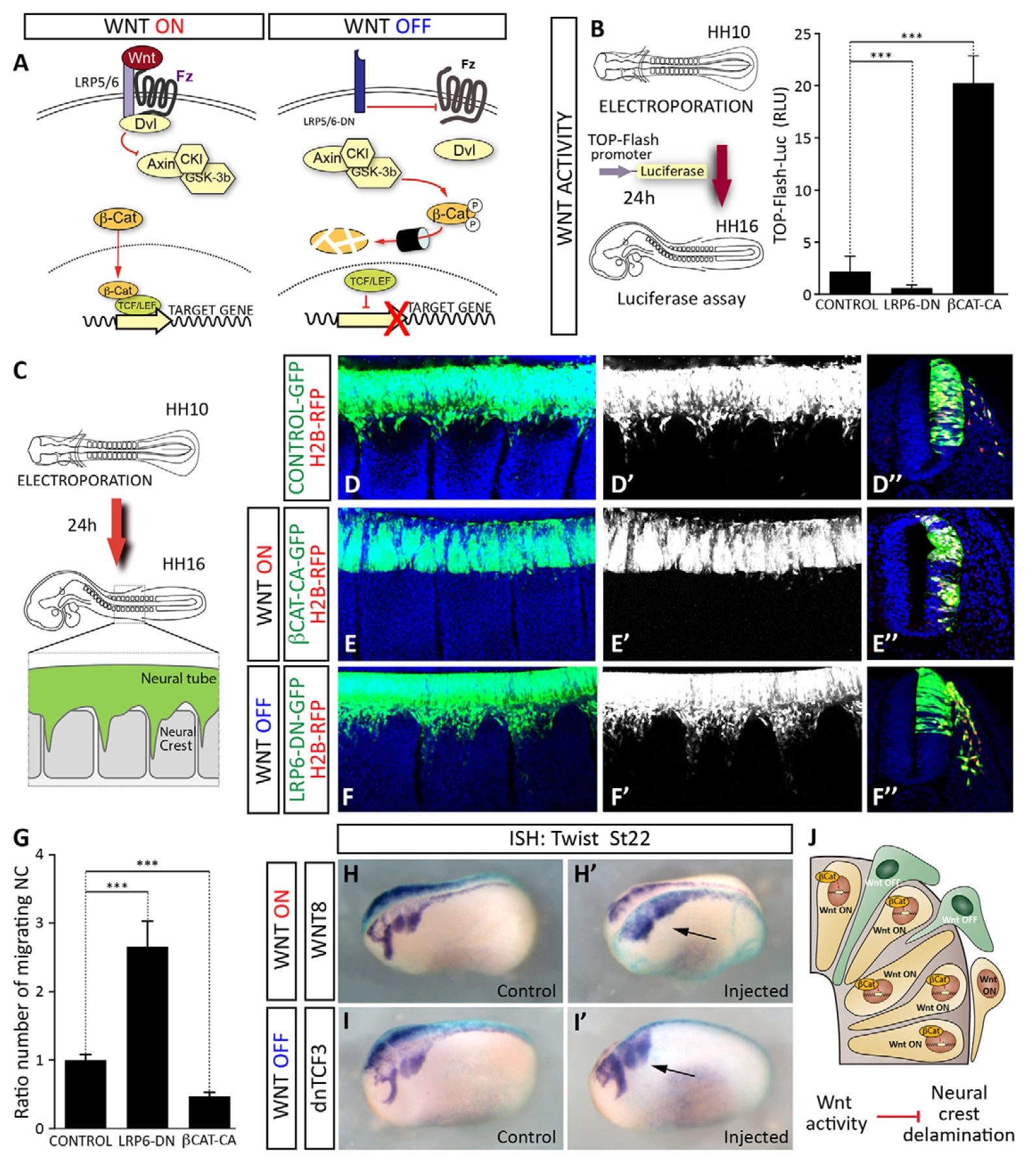 Delamination of neural crest (NC) cells is a bona fide physiological model of epithelial-to-mesenchymal transition (EMT), a process that is influenced by Wnt/β-catenin signalling. Using two in vivo models, we show that Wnt/β-catenin signalling is transiently inhibited at the time of NC delamination. In attempting to define the mechanism underlying this inhibition, we found that the scaffold proteins Dact1 and Dact2, which are expressed in pre-migratory NC cells, are required for NC delamination in Xenopus and chick embryos, whereas they do not affect the motile properties of migratory NC cells. Dact1/2 inhibit Wnt/β-catenin signalling upstream of the transcriptional activity of T cell factor (TCF), which is required for EMT to proceed. Dact1/2 regulate the subcellular distribution of β-catenin, preventing β-catenin from acting as a transcriptional co-activator to TCF, yet without affecting its stability. Together, these data identify a novel yet important regulatory element that inhibits β-catenin signalling, which then affects NC delamination.
